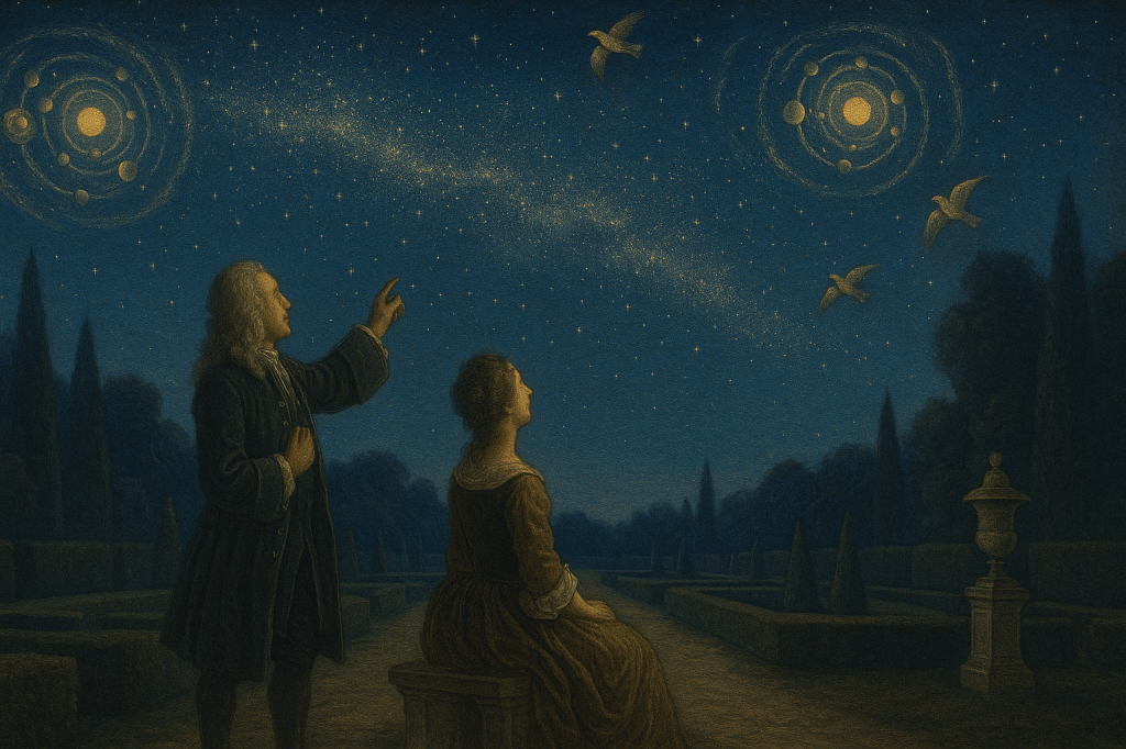 L’auteur aborde ensuite un phénomène qui avait intrigué les astronomes depuis l’Antiquité : la Voie lactée. Il explique à la Marquise que cette blancheur laiteuse qu’on voit dans le ciel est en réalité une concentration d’une multitude d’étoiles si lointaines et serrées qu’elles en paraissent confondues en une lumière continue. Il reprend ici clairement la découverte de Galilée, qui le premier, avec sa lunette, avait résolu la Voie lactée en étoiles en 1610. Fontenelle appelle ces étoiles de la Voie lactée « des petites étoiles invisibles aux yeux à cause de leur petitesse », formant comme des « mini-tourbillons » ou archipels d’astres. Il pousse même la fantaisie à imaginer que ces petits mondes de la Voie lactée sont si rapprochés que d’un monde à l’autre, on pourrait presque s’interpeller ! Il évoque l’image charmante d’oiseaux, ou de pigeons voyageurs, qui voleraient d’une planète d’un de ces systèmes à une planète voisine pour porter des messages. C’est une métaphore poétique audacieuse : elle concrétise l’idée de proximité relative de certains mondes, et amuse la Marquise (et le lecteur) en suggérant une sorte de communication inter-mondes par des moyens simples (des pigeons cosmiques !). Bien entendu, c’est une hyperbole humoristique – Fontenelle ne prétend pas sérieusement qu’il y a des pigeons de l’espace –, mais cette image de « cette fourmilière d’astres, et cette graine de mondes » (selon ses termes) frappe l’esprit et fait entrevoir concrètement l’immensité peuplée de la galaxie. La Marquise en est ravie, même si cela ajoute encore à l’énormité de l’univers qu’elle doit concevoir. Fontenelle la gâte ici en images évocatrices : il compare par exemple la Voie lactée à un archipel d’îles (il cite les Maldives comme métaphore : des milliers de petites îles séparées par de minces chenaux d’eau qu’on franchirait aisément). De même, les petits tourbillons stellaires de la Voie lactée seraient assez près pour qu’on puisse presque « se donner la main » d’un monde à l’autre. Cette avalanche métaphorique contribue à dédramatiser l’infini en le rendant imagé et même ludique. Au lieu d’un effroi, on a devant les yeux un tableau chatoyant de milliers de mondes papillonnants.