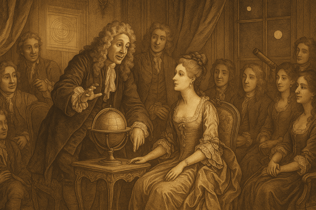 Un aspect crucial de la préface est l’annonce du dispositif narratif original de l’ouvrage. Fontenelle indique avoir introduit dans son livre le personnage d’une femme – une marquise – « qui n’a jamais ouï parler de ces choses-là » et qui se fait instruire peu à peu. Cette fiction d’une élève profane poursuit un double but : d’une part, rendre l’exposition plus vivante et agréable grâce à l’échange dialogué ; d’autre part, encourager le public féminin à s’intéresser à la philosophie et aux sciences. Au XVIIe siècle, les femmes de la bonne société recevaient rarement une éducation scientifique, qu’on jugeait trop austère ou incompatible avec leur rôle social. Fontenelle, en choisissant une interlocutrice marquise, défie ces préjugés de manière élégante. Il montre qu’avec un minimum de curiosité et d’effort – comparable à celui requis pour suivre l’intrigue d’un roman comme La Princesse de Clèves, remarque-t-il malicieusement– une personne non spécialiste peut comprendre des concepts astronomiques complexes. C’est là un hommage aux qualités d’esprit des femmes du grand monde et un clin d’œil aux salons mondains de l’époque, où l’on prisait les conversations brillantes. D’ailleurs, le ton galant et enjoué des Entretiens reflète précisément celui de ces salons de la fin du XVIIe siècle, empruntant aux codes de la galanterie et de la préciosité pour mieux faire passer le savoir. En cela, Fontenelle s’inscrit dans le courant de la littérature mondaine, tout en y insérant un contenu scientifique sérieux.