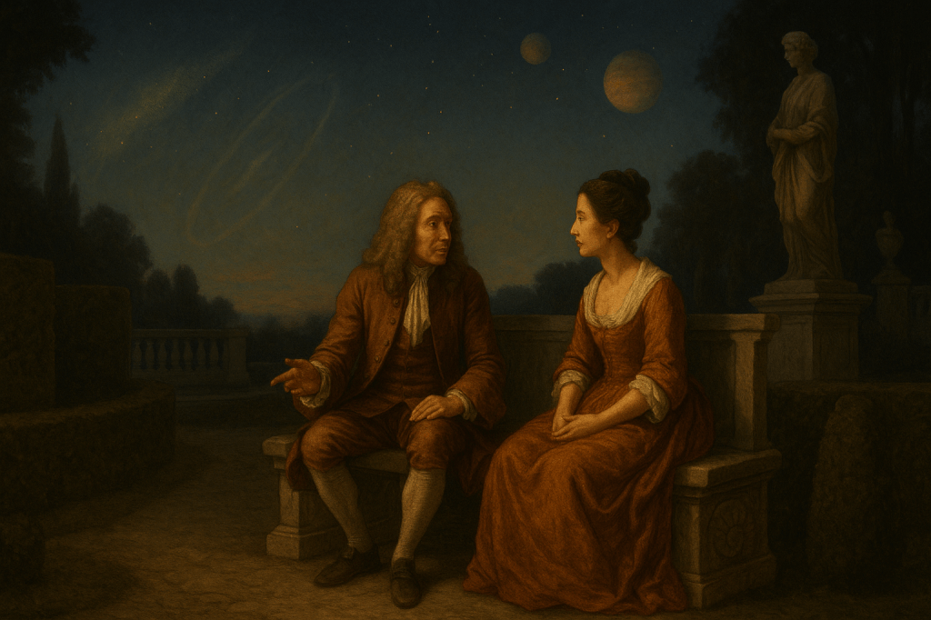 La soirée s’ouvre sur une anecdote que partage la Marquise. Elle raconte qu’en présence de deux hommes savants (l’un galant et l’autre un peu pédant), elle a avancé l’idée désormais chère à son cœur : « toutes les planètes sont habitées ». La réaction des deux hommes l’a intriguée : celui qui la tenait en haute estime a cru qu’elle plaisantait (ne pouvant imaginer, sans doute, qu’une femme sérieuse croie à cela), tandis que l’autre, plus malicieux, l’a prise au sérieux et s’en est moqué ou a contesté. Cette anecdote révèle deux choses : d’abord que la Marquise s’est appropriée le propos au point de le défendre publiquement, signe ultime de son instruction réussie ; ensuite, que l’opinion selon laquelle les planètes sont habitées est encore considérée comme étonnante, voire extravagante, dans la bonne société. Elle n’est pas (pas encore) un lieu commun. La Marquise, un peu décontenancée, demande alors au philosophe comment juger de la crédibilité de cette opinion qu’elle a embrassée. En filigrane, elle veut savoir : ai-je eu raison de l’affirmer ? Est-ce si sûr que ça ?