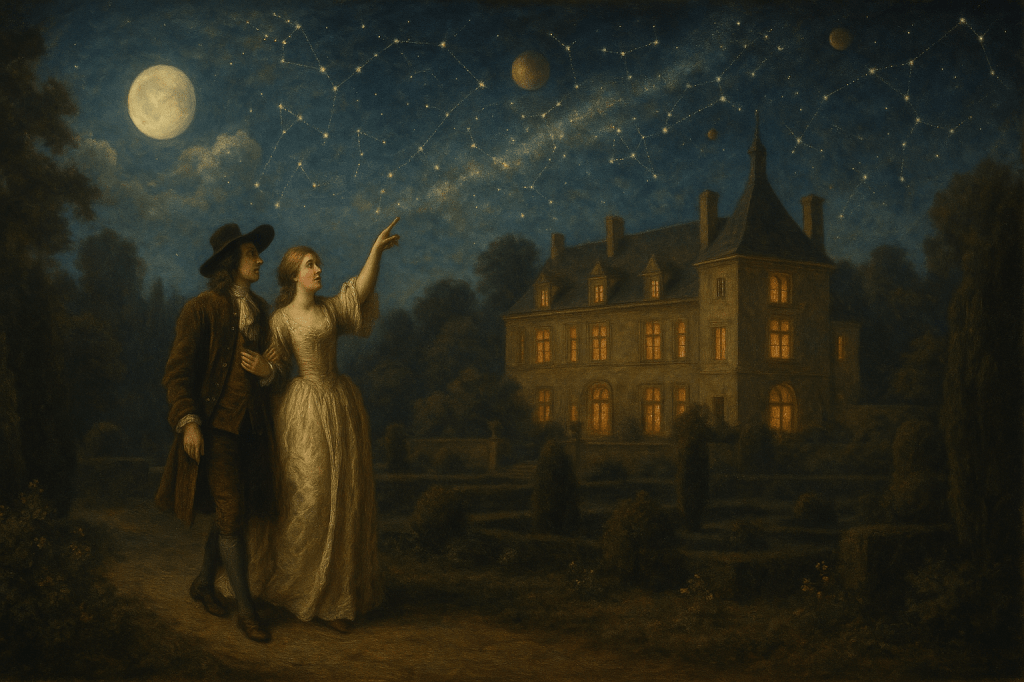 La Marquise voulut m’engager pendant le jour à poursuivre nos entretiens, mais je lui représentai que nous ne devions confier de telles rêveries qu’à la Lune et aux étoiles, puisqu’aussi bien elles en étaient l’objet. Nous ne manquâmes pas d’aller le soir dans le parc, qui devenait un lieu consacré à nos conversations savantes.